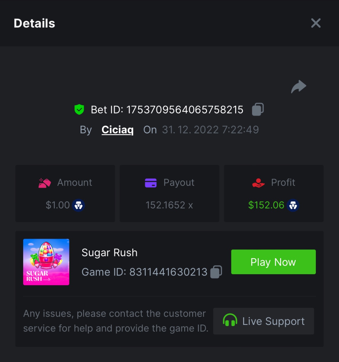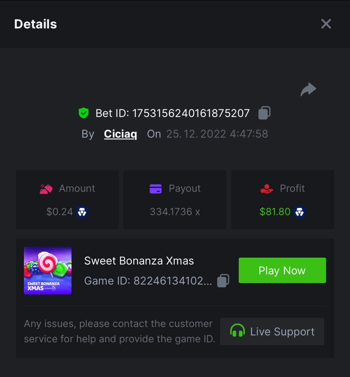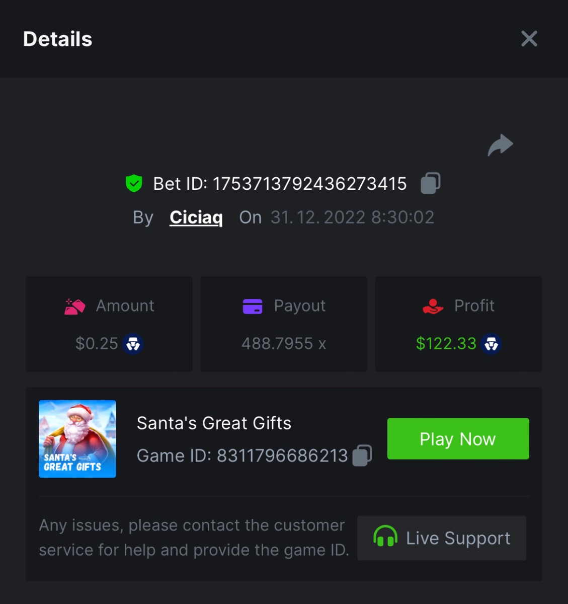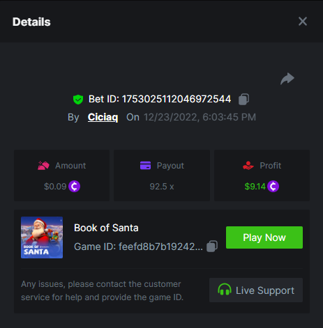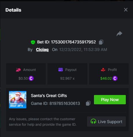Book of Elves - 120.62x - https://bc.game/#/sd/10ZYH8DLGT55W3 Book of Xmas - 172.67x - https://bc.game/#/sd/10ZYKF4BSFYQS3 Wild Santa II - 21.02x - https://bc.game/#/sd/10ZXHYK4CVZGNN Santa’s Wild Night - 38.41x - https://bc.game/#/sd/10ZXYD8RFBZ5SJ -