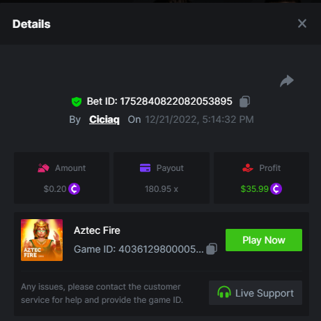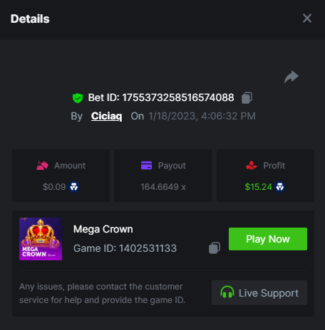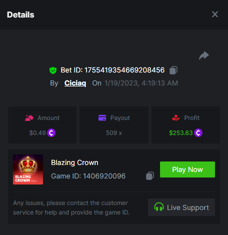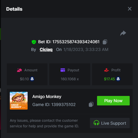 Amigo Monkey - 160.11x https://bc.game/#/sd/111M45NN2J10CZ Blazing Crown - 509x https://bc.game/#/sd/111OO7BAHZI3O3 Book of Jurassic - 470x https://bc.game/#/sd/111P0NJMAP800J Mega Crown - 164.66x https://bc.game/#/sd/111NETDZABK8B7 Regal Fruits 100 - 102.7x https://bc.game/#/sd/111OQ69Y9TN6KZ