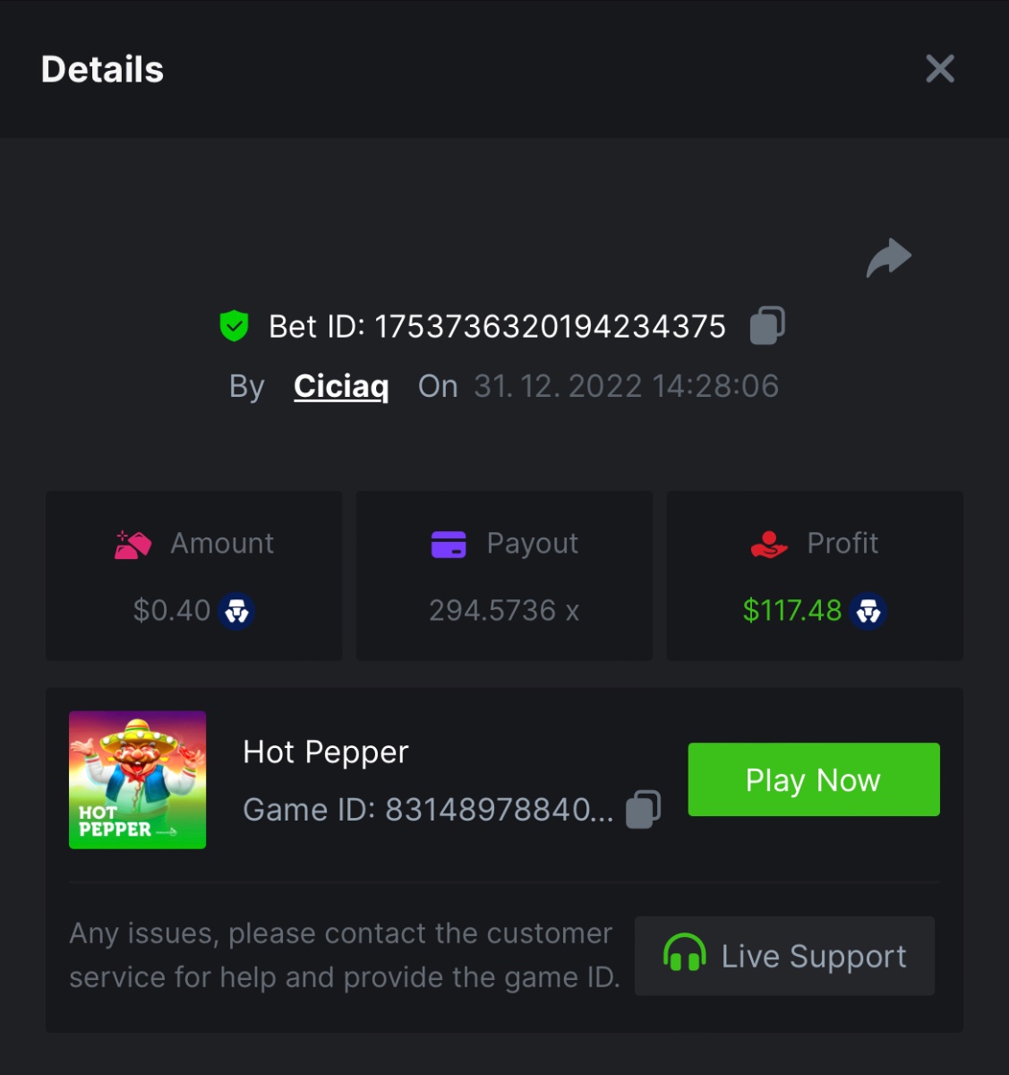 Aztec Fire - 180.95x https://bc.game/#/sd/10ZQ86YI56HFDF Sun of Egypt 3 - 95x https://bc.game/#/sd/10ZMOPVL148X77 Sticky Piggy - 220.25x https://bc.game/#/sd/10ZNWQJ1OELQ8J Big Heist - 392x https://bc.game/#/sd/10ZLSZEBAY239V Green Chilli - 138x https://bc.game/#/sd/10ZP76MH4GKO43