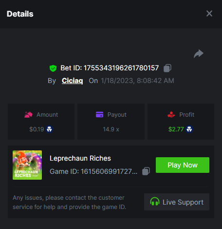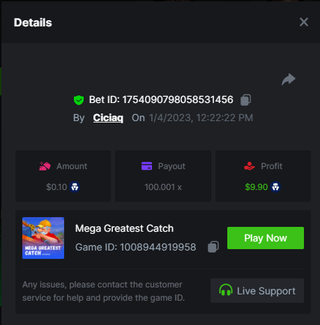 Wolf hiding bonus buy - 143.64x https://bc.game/#/sd/110ORR7MEZ3GUR Elven Princesses - 45.75x https://bc.game/#/sd/110OMVCRMYPBTF Mega Greatest Catch - 100x https://bc.game/#/sd/110OC2PEI3JR4J Cycle Of Luck - 71.07x https://bc.game/#/sd/110OMXKPD9LLOZ Collapsed Castle - 100.1x https://bc.game/#/sd/110NL8OBHCZDHV
