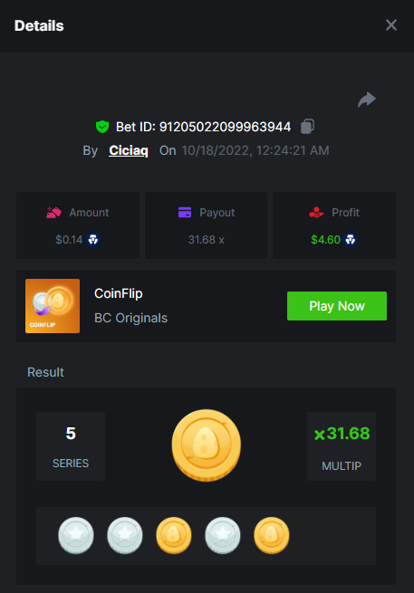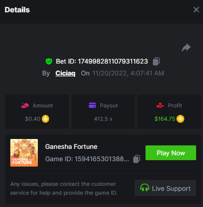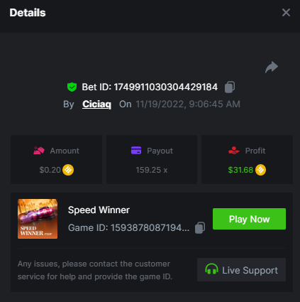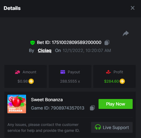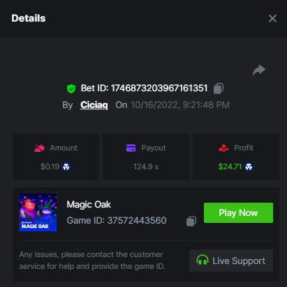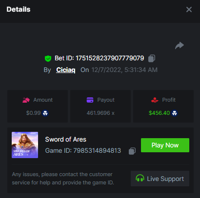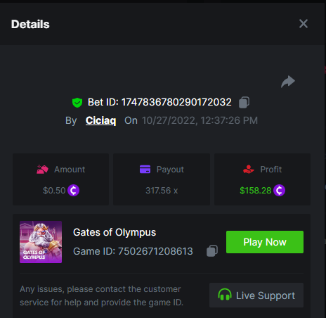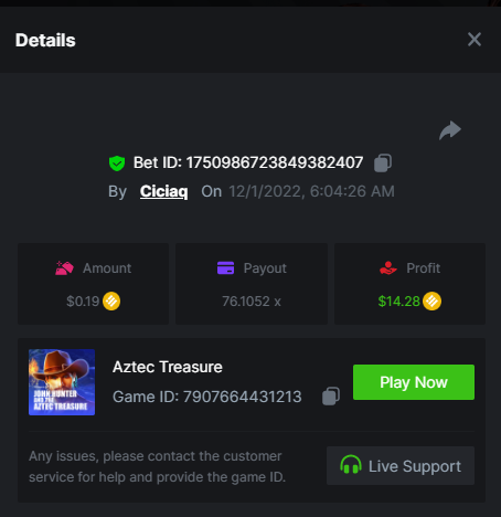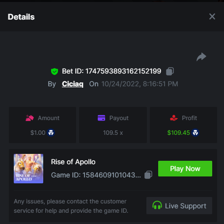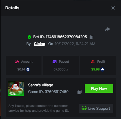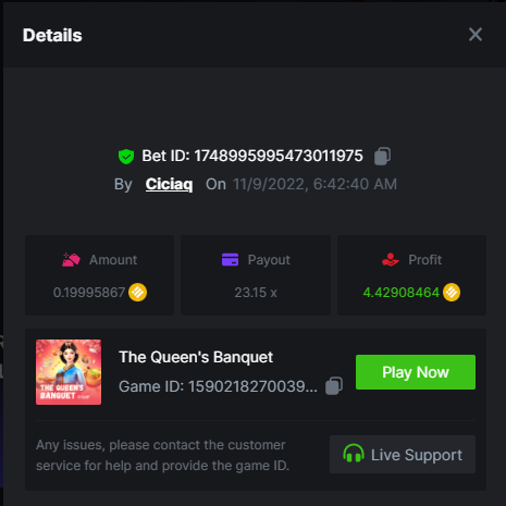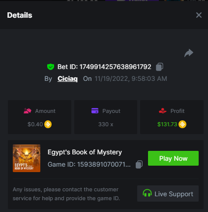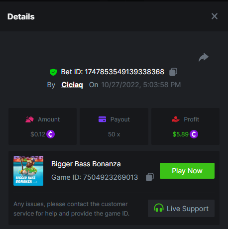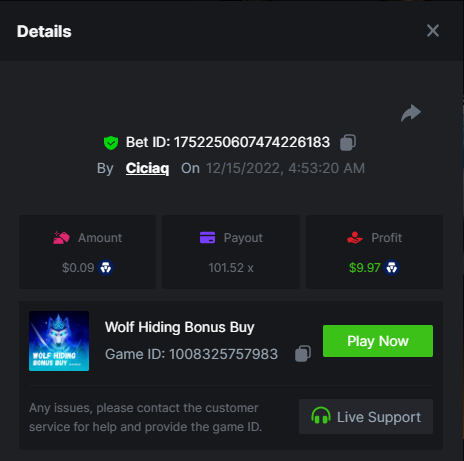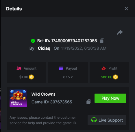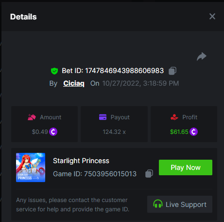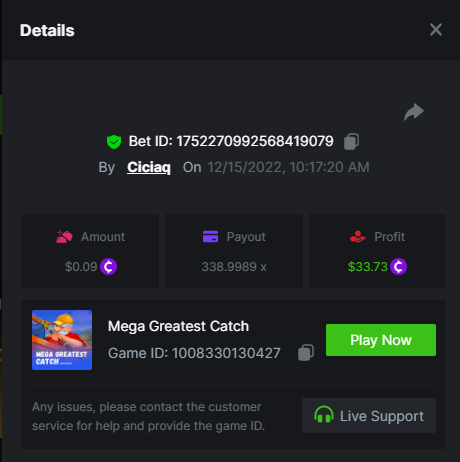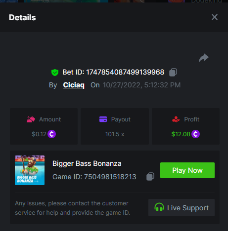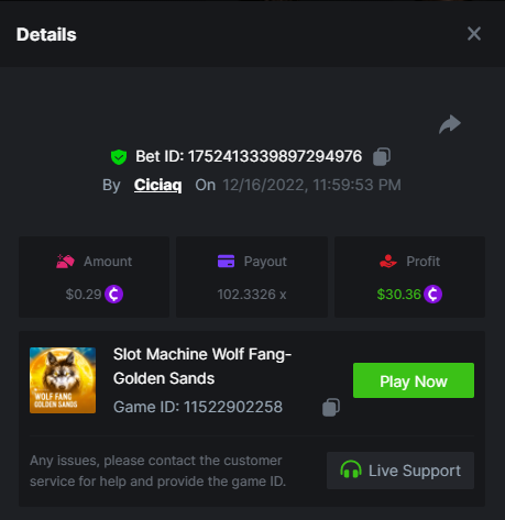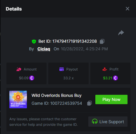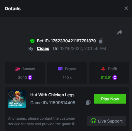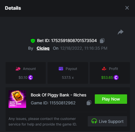 1. Book of Elves - 280.78x https://bc.game/#/sd/10ZK2Y591AUFWZ Book of Piggy Bank Riches - 537.5x https://bc.game/#/sd/10ZJC3O9P52J9V Wolf Fang - Golden Sands - 102.33x https://bc.game/#/sd/10ZEGDKTFN3J83 Athena's Glory - 135.67x https://bc.game/#/sd/10ZK8GPA2RAXAR Hut with Chicken Legs - 140x https://bc.game/#/sd/10ZC6PR7G57PQR Bounty: https://bc.game/#/sd/10ZDBH1IA77MZ7