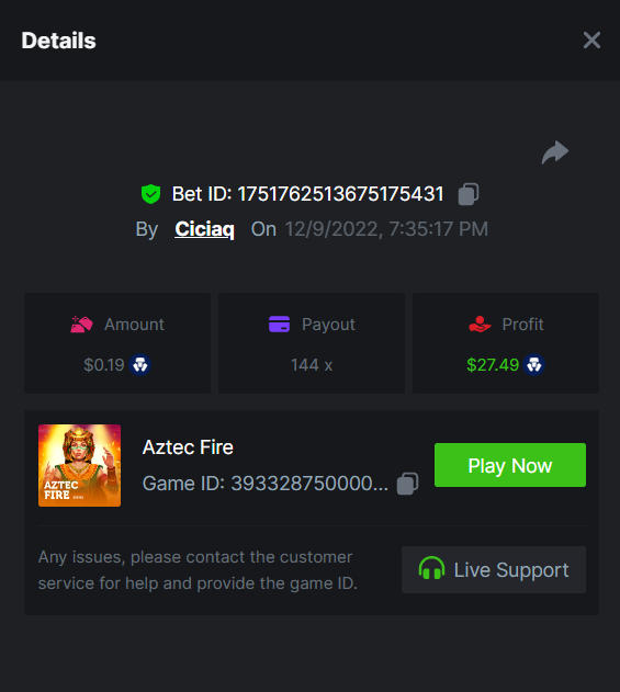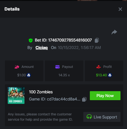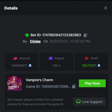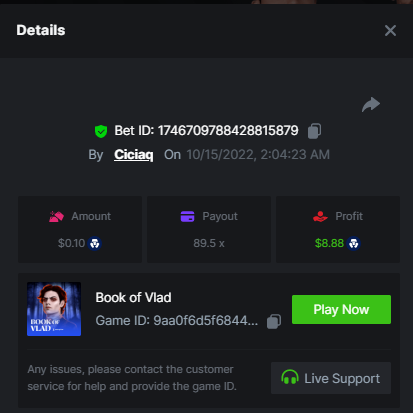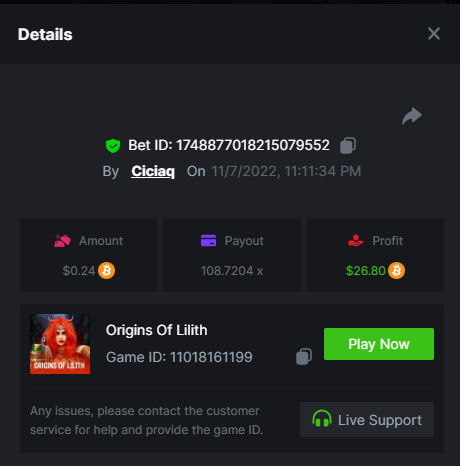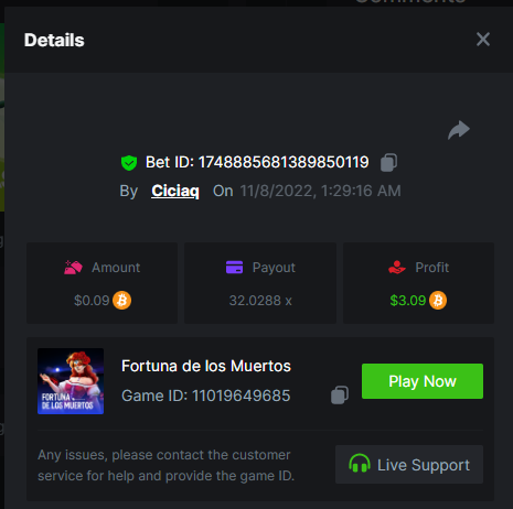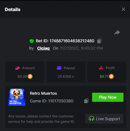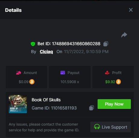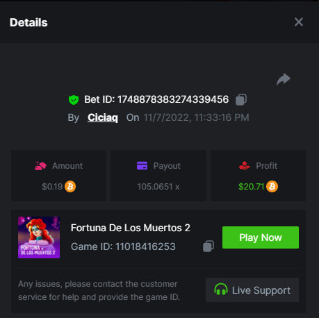 11. Book Of Muertos - 200.5x https://bc.game/#/sd/10WRANURH6N02B Fortuna de los Muertos II - 105.07x https://bc.game/#/sd/10WPRPZ7553TW3 Fortuna de los Muertos - 32.03x https://bc.game/#/sd/10WPYVPN9M54B7 Retro Muertos - 25.63x https://bc.game/#/sd/10WPL0Z9875FYR Book of Skulls - 101.59x https://bc.game/#/sd/10WPIWFN72UR6B Origins of Lilith - 108.72x https://bc.game/#/sd/10WPQDQWZSWETV