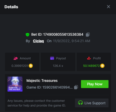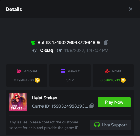 9. Majestic Treasures - 126.4x https://bc.game/#/sd/10WTBH7MBGOVMB The Queen's Banquet - 23.15x https://bc.game/#/sd/10WSZJJ2UUGT8Z Garuda Gems - 151.1x https://bc.game/#/sd/10WSC16Z49XGCZ Heist Stakes - 34x https://bc.game/#/sd/10WTPTXNF7G3YR