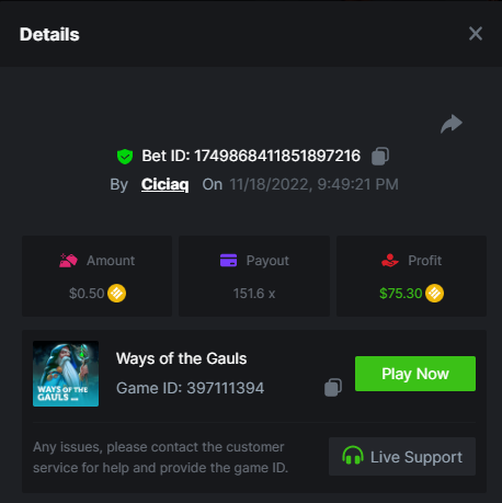 8. Wild Spin - 108.4x https://bc.game/#/sd/10XHK7U8901X5F Wild Crowns - 87.5x https://bc.game/#/sd/10XHQ8W683NGNN Book of Light - 170.5x https://bc.game/#/sd/10XHODMA7L49HV Lucky Cat - 226x https://bc.game/#/sd/10XHHEOEKPFJ0Z Ways of the Gauls - 151.6x https://bc.game/#/sd/10XGUKCQOVPHXV