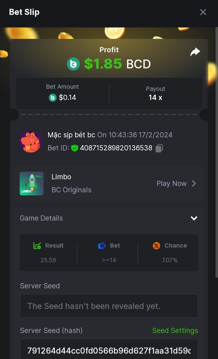 5.10x: https://bc.game/#/sd/11F25MIOINC4R7 7x: https://bc.game/#/sd/11F25XFDPWQD0N 8x: https://bc.game/#/sd/11F25K16R0YGWJ