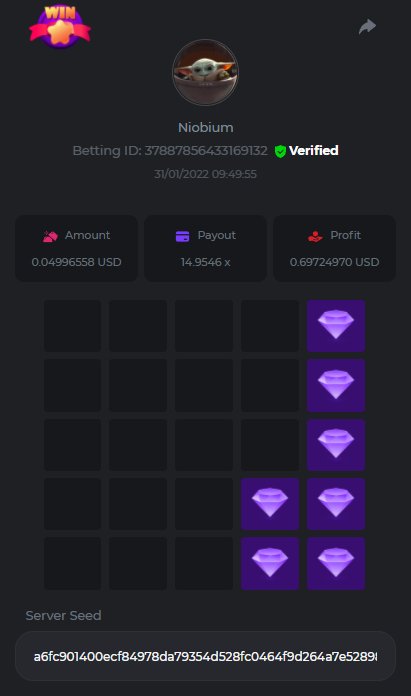 $1k Prestige Mines Challenge #15 Greetings! We are pleased to announce the fifteenth prestige available for any level VIPs, with a total prize pool of $1,000! Let’s see who can get the highest multiplier on our in-house Mines. Remember, coal and diamond have the same composition, but their values are extremely different from each other. The way you take on your challenges – how you use that pressure, will define whether you'll be coal or diamond. Don't be afraid of the stones in your path, dear players! Some of them could be diamonds. What's the Challenge? Win the highest multiplie you can on in-house Mines (Any number of mines & bombs is valid). The Top 20 players who reach the highest payouts will split a share of the prize pool, and anyone who completes the side bounty will receive an equal share of the $100. If the player submits multiple entries, only the highest payout will be considered. In case of a tie, the participant with a higher bet amount will be given the advantage. If there is a tie in the amount and payout, the one who posted or edited his post first shall be named the winner for the ranked spot. Minimum VIP There's no minimum VIP level Minimum Payout Minimum payout to qualify is 10x Minimum Bet Size $0.05 USD equivalent Eligible Coins All coins are eligible (excepting JB) Available Prizes 1st Place........$300 2nd Place......$200 3rd Place........$100 4th Place.........$60 5th-20th............$15 Bounty Prize...$100, equal share. EXTRA BOUNTY Post a winning bet with 21 mines - 3 diamonds (569.25x) and receive an equal share of the $100 prize pool! Original rules apply with min bet, minimum VIP. How to Enter To enter, copy the bet ID of the bet you'd like to submit. Once you've copied it, post it as a reply to this thread like so: Betting ID: 37887856433169132 In the same post, upload a screenshot of your win by clicking the game ID WITH VIEW IN USD mode ENABLED (accessible at the bottom of dropdown menu for your wallet up top. This way, we can ensure that your bet indeed met the minimum requirement at the time of placing it: Betting ID: 37887856433169132 Please combine all of your hits together in a SINGLE post. Edit your existing post for additional hits, don't create a new post. Bets must be posted within 24 hours of placing bet in order to keep things fair for everyone. Bets must be made during the specified time window stated above. This thread will lock automatically when the time period is over. One (1) entry per household. Anyone found attempting to win multiple prizes will be disqualified from this challenge as well as all future challenges. Failure to follow instructions will result in your submission being null and void. By entering this challenge, you acknowledge that BC.Game has the final decision on results and placement. Payouts will be made within 72 hours of challenge completion, please be patient, we promise you that we haven't forgotten. We check and double check to make sure the rightful winners receive their prize. Prizes will be paid out in BCD. Best of luck playing!