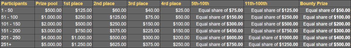 Congratulations to our winners! We had 12 participants completing the extra bounty, and all prizes were sent via private message Here is the ranking of the selected ones: Ranking Top 20 Ranking Username Prize Extra bonus 1st bassabar $300 $8.33 2nd Флинт $200 - 3rd Satoshimaker $100 $8.33 4th Mugen $60 - 5th CraftyCrypto85 $15 - 6th GKD69 $15 - 7th Sleepiez $15 $8.33 8th POLANA $15 $8.33 9th NiKE26 $15 $8.33 10th thiago18 $15 $8.33 11th Cryptoprem $15 $8.33 12th CivicMe $15 $8.33 13th Hoya_ $15 $8.33 14th Nashka $15 $8.33 15th _r_0_w3_n_4_ $15 $8.33 16th LemaK $15 $8.33 17th RORY $15 - 18th CryptoAngel $15 - 19th Aikamessa $15 - 20th neris $15 - To participate in any of our events, check out our official Promos & Events page here.