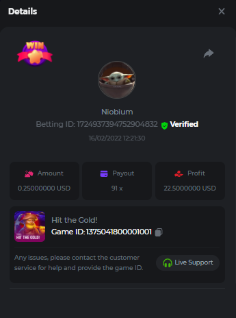 Welcome back VIPs to the awards show that never ends. We're so glad you could attend to our new Booongo Battle! This week we've a prize pool of up to $4,000! Players need to reach the highest payouts in four slots selected and multipliers will be summed together to rank, in addition, the ones who complete the extra bonus will receive 10% of the prize pool equally. Eligible Games Win the highest multiplier on the Booongo slots listed below Golden Dancing Lion Hit the Gold Tiger Jungle Solar Queen The highest multiplier reached in each slot will be added together and counted as total points. If the player submits multiple winning entries for the same slot, the entry with the highest multiplier will be valid. Minimum VIP Tier Must be VIP08 or higher in order to enter this challenge. Minimum Payout Minimum payout to qualify is 10x (in any slot) for a valid entry. Minimum Bet Size Golden Dancing Lion - $0.25 Hit the Gold - $0.25 Tiger Jungle - $0.25 Solar Queen - $0.20 Eligible Coins All cryptocurrencies are eligible (excepting JB) Prize Pool & Reward Breakdown The winners will win a share of the prize pool based on the detailed ranking below. Anyone who completes the side bounty will receive a share of a 10% of the prize pool. BOUNTY - Post a bet that shows exactly 309x or 187x payout on any of the 4 slots within the timeframe of this battle and receive a share of 10% of the prize pool! If nobody wins exactly payouts the player/s closest to one of the two multipliers will win this bounty! How to Enter To enter, copy the bet ID of the bet you'd like to submit. Once you've copied it, post it as a reply to this thread like so: Betting ID: 1724937394752904832 In the same post, upload a screenshot of your win by clicking the game ID WITH VIEW IN USD mode ENABLED (accessible at the bottom of dropdown menu for your wallet up top. This way, we can ensure that your bet indeed met the minimum requirement at the time of placing it: Example post - Betting ID: 1724937394752904832 Good luck everyone!