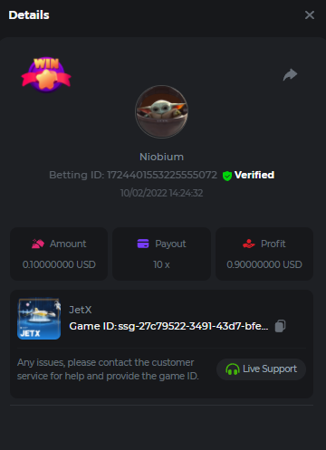 Hey, dear VIPs! This week we have another great news for you, a special battle with our provider Smartsoft Gaming, and with a prize pool of up to $5,000! The game selected is JetX, the dynamics of the game are similar to Crash Game, try to guess how high the multiplier jet will fly and leave before it explodes. We are looking forward to seeing the highest payouts achieved by our players. Any player who completes the side bounty will receive an equal share of 10% of the prize pool. What's the Battle? Win the highest multiplier you can on JetX (Minimum payout to qualify is 10x). If there's a tie between the total points of the players, the participant with the higher average bet amount (in USD) shall be the winner. Minimum VIP Tier Must be VIP08 or higher in order to enter this event. Minimum Bet Size $0.10 USD equivalent. Eligible Coins All cryptocurrencies are eligible (excluding free play mode). Prize Pool & Reward Breakdown The winners will win a share of the prize pool based on the detailed ranking below. Anyone who completes the side bounty will receive a share of a 10% of the prize pool. BOUNTY - Post your bet that shows at least 200x within the timeframe of this challenge and receive an equal share of 10% of the prize pool! Original rules apply with min bet, minimum payout. How to Enter To enter, copy the bet ID of the bet you'd like to submit. Once you've copied it, post it as a reply to this thread like so: Betting ID: 1724401553225555072 In the same post, upload a screenshot of your win by clicking the game ID WITH VIEW IN USD mode ENABLED (accessible at the bottom of dropdown menu for your wallet up top. This way, we can ensure that your bet indeed met the minimum requirement at the time of placing it: Example post - Betting ID: 1724401553225555072 Good luck to all participants