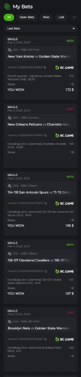 I see you won all 5 bets, 4 handicaps incl. Overtime and 1 handicap on 1st quarter only. Perhaps, bc.game haven't taken into account bets won by quarters, only totals.