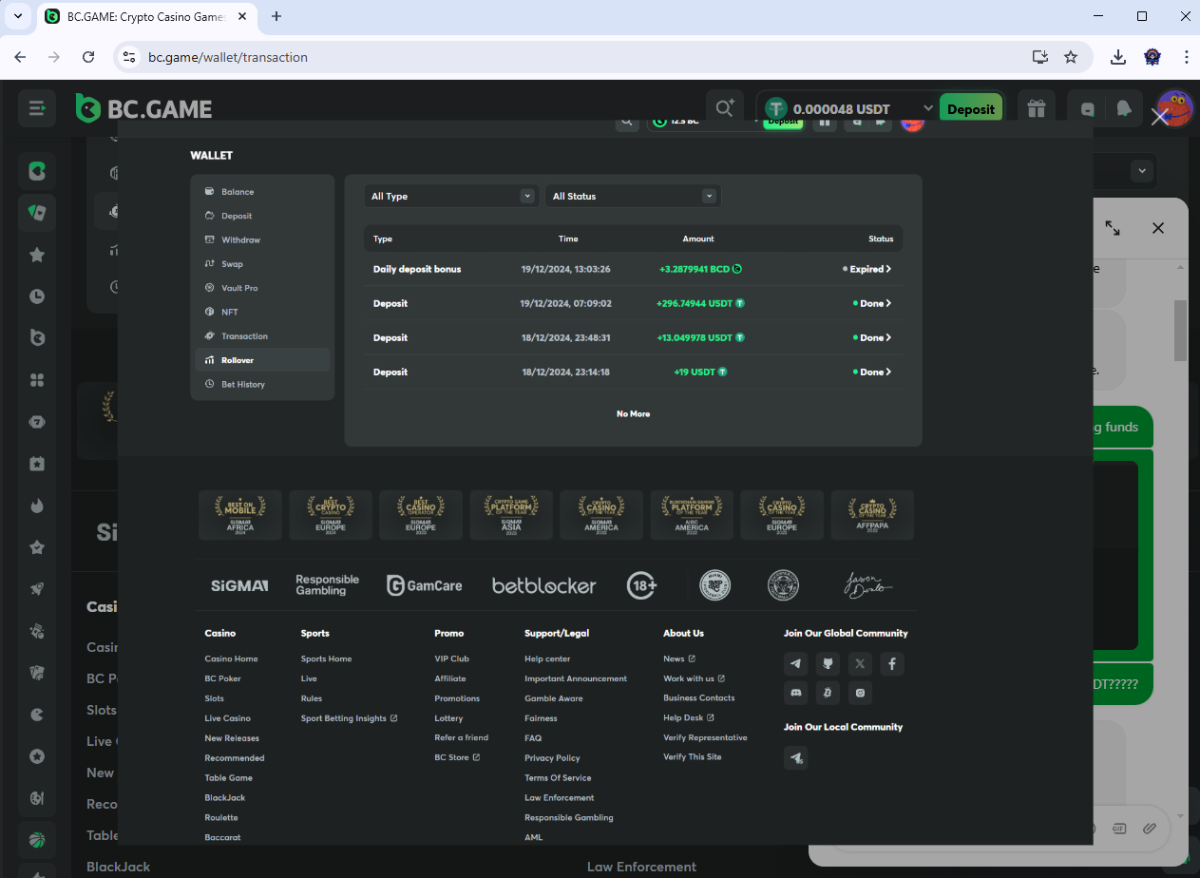 1. Hey Guys Look at my recent post, confirms everything!! Just a heads up I have been fighting with the support team for months now (which we all know is terrible) On the 19/12/2024 my account was logged out and when I went to log back in I cant as it asked for 2FA codes which I never set up At that time I had around $300 USDT in the account. I have just been able to get the 2FA removed and get back into my account today. Low and behold $0 in the account Now you can clearly see in the photos the deposit was 77 days ago and when I go to transactions there is nothing for the last 90 days. They have scammed my account and taken the funds. Watch out guys look at all the photos and you will see what I mean. BC game wallet matches TX id, no transactions in the last 90 days is proof that its was scammed!