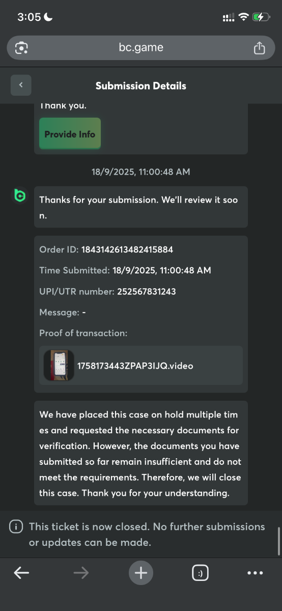 I didn’t receive my money from 8days I submitted all the proofs to them but nothing happened please consider the my problem solve it please my order Id-1843142613482415884 amount -601 utr -252567831243 date -13/9/2025