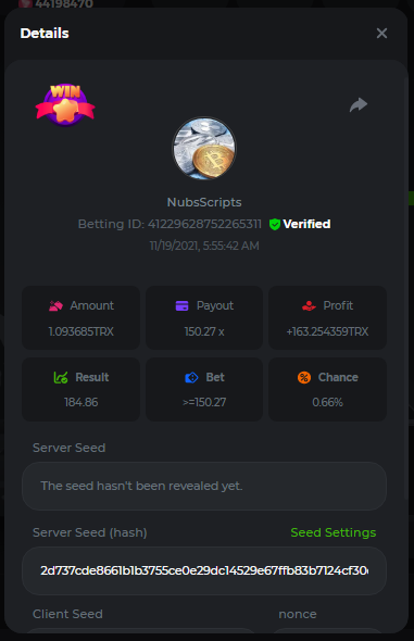 The get history has always loaded the previous 20 rolls. The only way to load more is to get from verification site which is beyond me. It grabs those 20 previous rolls because that's 20 more than just pressing Start and we want to see some sort of pattern before betting. It now adjusts the bet according to losses. The Update won't show correct Profit as the ability to call the currency.amount returns the same amount as when the script 1st started. To me this is old and spaghetti looking with crap all over it. This style of betting based upon losses generates a certain level of profit, but is not even close to basing bets on the Streaks % and pausing betting when no streaks. //******************* Nubs27's Smart Script for Crash ******************* // // // // If you find this script helpful please consider donating to Nubs27 or tipping on NanoGames.io: // Referral Link: https://n-luzqe.nanogames.io/ // // Donations accepted in many coin/token types. List & Addresses: // https://sites.google.com/view/nanogamescrashscripts/home/donation-addresses // // // var config = { mainTitle: { label: '*** Nubs27\'s Smart Script for Crash ***', type: 'title' }, auto: { label: '', value: 'Script', type: 'radio', options: [ { value: 'Script', label: 'Script chooses Base Bet'}, { value: 'Player', label: 'Player chooses Base Bet'} ]}, bet: { label: 'Base Bet', value: currency.minAmount, type: 'number' }, lossTitle: { label: 'Stop When ', type: 'title' }, stop: { label: 'Coins Lost >', value: 1, type: 'number' }, end: { label: 'Minutes >', value: 250, type: 'number' }, profit: { label: 'Profit >', value: 100, type: 'number' }, }; function main () { //PayOuts checked in the Stats Update const MultiplierArray = [2.5, 3.00, 5.00, 6.00, 7.00]; const LMultiplierArray = [10.00, 20.00, 50.00, 100.00]; var version = "v2.3"; var PayOutPercents = []; var PayOutConfidence = []; var Array2Filter = []; var FilteredArray = []; var ScriptHistory = []; var Trains = []; // Red Train IDs - finding gaps between & correlation between gap & duration var History = []; var RoundsPlayed = 0; var RoundsViewed = 0; var LastGameID = 1; var CurrentGameID = LastGameID + 1; var MinimumBet = currency.minAmount; var MaxBet = (currency.amount / 10); var TotalBets = 0; var CurrentMultiplier = MultiplierArray[1]; var LastMultiplier = MultiplierArray[1]; var MaxLossesEncountered = 3; var MostLost = 0; var LargestMulitplier = 2; var BaseBet = config.bet.value; var CurrentBet = BaseBet; var LastBet = BaseBet; var LastShrek = CurrentGameID; var LastTrain = 0; var Gap = 0; var AverageGap = 0; var LargestBet = [0,0]; var Enable100ID = 1000000; var LastResult = "Won"; var CoinLost = 0; var StopLossCoin = config.stop.value; var Losses = 0; var Wins = 0; var Red = 0; var Green = 0; var StartTime = new Date(); var EndTime = new Date(); var TimeDiff = (EndTime - StartTime); var StartBalance = currency.amount; var EndBalance = 0; var Profit = 0; var ATHProfit = 0; var ProfPerMin = 0; var NetProfit = 0; var DisplayGreeting = "False"; var GotHistory = "False"; var BetYet = "False"; var LoggedBetData = "False"; var GameInfoLogged = "False"; var StrategyFound = "False"; var IsPlaying = "False"; var UpdateBets = "False"; var Enable100 = "False"; var LastCrash = 0; var PrevCashOut = 0; var WonAmount = 0; var FindThisMultiplier = 1; var FindShouldHave = 2; var ThisAverage = 1; var HistorySlice = 50; var Paused = "True"; var IndexMax = PayOutConfidence[0]; var MaxIndex = 0; var GetNumber = 0; // Welcome the Player to the Script console.clear(); engine.on('GAME_STARTING', function () { if (DisplayGreeting == "False") { log.info(' Nubs27s Smart Script for Crash'); log.info(" ****************"); log.info("See Web Console for more Information (Press F12)"); console.log('%c~~~~~~~~~~~~~~~~~ Nubs27\'s Smart Script for Crash ~~~~~~~~~~~~~~~~~','color:Purple; font-weight:bold'); console.log('%cScript Start Time: ' + StartTime,'color:Purple; font-weight:200'); console.log(' %cWelcome ' , 'color:Purple; font-weight:bold'); console.log(' %cYour Starting Balance is: ' + StartBalance + ' ' + currency.currencyName, 'color:Purple; font-weight:bold'); if (config.auto.value == 'Player') { if (config.stop.value > currency.amount) { MaxBet = (currency.amount / 10); config.stop.value = currency.amount * 0.98; console.log('%c[WARNING]: Stop Loss is above your Bankroll','color:Orange; font-weight:bold'); console.log('%c[WARNING]: Stop Loss Updated to ' + config.stop.value, 'color:Orange; font-weight:bold'); } if (config.bet.value > (config.stop.value / 15000)) { log.info('[WARNING]: Script Recommends a bankroll of at least ' + (BaseBet * 15000) + '' + currency.currencyName + ' for the Base Bet you provided'); log.info('[WARNING]: Script Recommends a bankroll of at least ' + (BaseBet * 20000) + '' + currency.currencyName + ' for the Base Bet you provided'); log.info('[WARNING]: Script Recommends a bankroll of at least ' + (BaseBet * 25000) + '' + currency.currencyName + ' for the Base Bet you provided'); } console.log(' %cYou Input: ' + BaseBet + ' ' + currency.currencyName + ' as the Base Bet', 'color:Purple; font-weight:bold'); }else{ betupdate(); console.log(' %cYour Starting Base Bet is: ' + BaseBet + ' ' + currency.currencyName, 'color:Purple; font-weight:bold'); } console.log(' %cYour Stoppers are: Coin Lost > ' + config.stop.value + '; Minutes > ' + config.end.value + '; Profit > ' + config.profit.value, 'color:Purple; font-weight:bold'); console.log('%c~~~~~~~~~~~~~~~~~~~~~~~~~~~~~~~~~~~~~~~~~~~~~~~~~~~~~~~~~~~~~~~~~~','color:Purple; font-weight:bold'); if (config.stop.value > currency.amount) { MaxBet = (currency.amount / 10); config.stop.value = currency.amount * 0.95; console.log('%c[WARNING]: Stop Loss Updated to ' + config.stop.value, 'color:Orange; font-weight:bold'); } } DisplayGreeting = "True"; if (GotHistory == "False") { getnanohistory(); GotHistory = "True"; console.log(ScriptHistory); LastShrek = []; LastTrain = []; } // // // //Everything above here only runs 1
