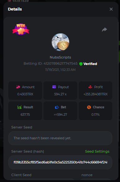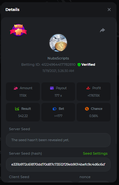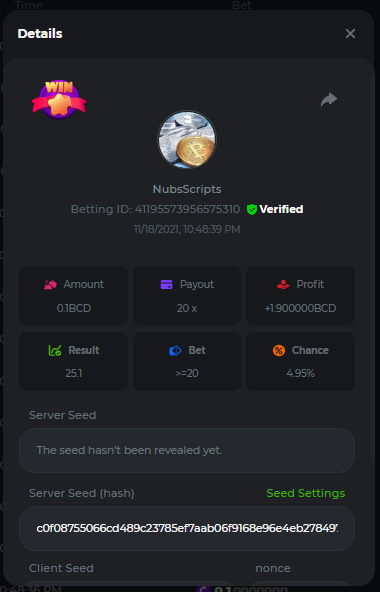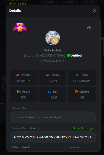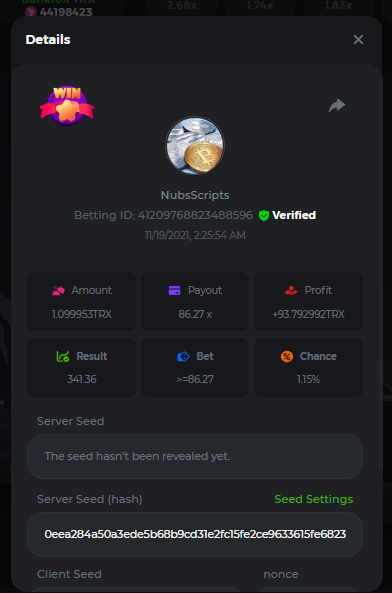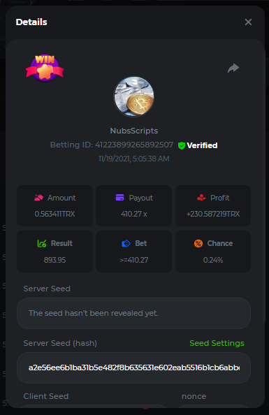 Yes this thread is a little old but hopefully you all are still around. I'm going to post a script from 3 years ago. I'm pretty sure the responses from server have changed so it won't run. However, this script will change the payout based upon the board. At one point it ran on ng for almost 30 days straight without interruption. Documented and posted screenshots along the way. Started with free 0.005 Eth from spider back then and got it up to 0.89 Eth and then I got scared and shut it down. //******************* Nubs27's Smart Script for Crash ******************* // // // // If you find this script helpful please consider donating to Nubs27 or tipping on NanoGames.io: // Referral Link: https://n-luzqe.nanogames.io/ // // Donations accepted in many coin/token types. List & Addresses: // https://sites.google.com/view/nanogamescrashscripts/home/donation-addresses // // // var config = { mainTitle: { label: '*** Nubs27\'s Smart Script for Crash ***', type: 'title' }, auto: { label: '', value: 'Script', type: 'radio', options: [ { value: 'Script', label: 'Script chooses Base Bet'}, { value: 'Player', label: 'Player chooses Base Bet'} ]}, bet: { label: 'Base Bet', value: currency.minAmount, type: 'number' }, lossTitle: { label: 'Stop When ', type: 'title' }, stop: { label: 'Coins Lost >', value: 1, type: 'number' }, end: { label: 'Minutes >', value: 250, type: 'number' }, profit: { label: 'Profit >', value: 100, type: 'number' }, }; function main () { //PayOuts checked in the Stats Update const MultiplierArray = [2.5, 3.00, 5.00, 6.00, 7.00]; const LMultiplierArray = [10.00, 20.00, 50.00, 100.00]; var version = "v2.3"; var PayOutPercents = []; var PayOutConfidence = []; var Array2Filter = []; var FilteredArray = []; var ScriptHistory = []; var Trains = []; // Red Train IDs - finding gaps between & correlation between gap & duration var History = []; var RoundsPlayed = 0; var RoundsViewed = 0; var LastGameID = 1; var CurrentGameID = LastGameID + 1; var MinimumBet = currency.minAmount; var MaxBet = (currency.amount / 10); var TotalBets = 0; var CurrentMultiplier = MultiplierArray[1]; var LastMultiplier = MultiplierArray[1]; var MaxLossesEncountered = 3; var MostLost = 0; var LargestMulitplier = 2; var BaseBet = config.bet.value; var CurrentBet = BaseBet; var LastBet = BaseBet; var LastShrek = CurrentGameID; var LastTrain = 0; var Gap = 0; var AverageGap = 0; var LargestBet = [0,0]; var Enable100ID = 1000000; var LastResult = "Won"; var CoinLost = 0; var StopLossCoin = config.stop.value; var Losses = 0; var Wins = 0; var Red = 0; var Green = 0; var StartTime = new Date(); var EndTime = new Date(); var TimeDiff = (EndTime - StartTime); var StartBalance = currency.amount; var EndBalance = 0; var Profit = 0; var ATHProfit = 0; var ProfPerMin = 0; var NetProfit = 0; var DisplayGreeting = "False"; var GotHistory = "False"; var BetYet = "False"; var LoggedBetData = "False"; var GameInfoLogged = "False"; var StrategyFound = "False"; var IsPlaying = "False"; var UpdateBets = "False"; var Enable100 = "False"; var LastCrash = 0; var PrevCashOut = 0; var WonAmount = 0; var FindThisMultiplier = 1; var FindShouldHave = 2; var ThisAverage = 1; var HistorySlice = 50; var Paused = "True"; var IndexMax = PayOutConfidence[0]; var MaxIndex = 0; var GetNumber = 0; // Welcome the Player to the Script console.clear(); engine.on('GAME_STARTING', function () { if (DisplayGreeting == "False") { log.info(' Nubs27s Smart Script for Crash'); log.info(" ****************"); log.info("See Web Console for more Information (Press F12)"); console.log('%c~~~~~~~~~~~~~~~~~ Nubs27\'s Smart Script for Crash ~~~~~~~~~~~~~~~~~','color:Purple; font-weight:bold'); console.log('%cScript Start Time: ' + StartTime,'color:Purple; font-weight:200'); console.log(' %cWelcome ' , 'color:Purple; font-weight:bold'); console.log(' %cYour Starting Balance is: ' + StartBalance + ' ' + currency.currencyName, 'color:Purple; font-weight:bold'); if (config.auto.value == 'Player') { if (config.stop.value > currency.amount) { MaxBet = (currency.amount / 10); config.stop.value = currency.amount * 0.98; console.log('%c[WARNING]: Stop Loss is above your Bankroll','color:Orange; font-weight:bold'); console.log('%c[WARNING]: Stop Loss Updated to ' + config.stop.value, 'color:Orange; font-weight:bold'); } if (config.bet.value > (config.stop.value / 15000)) { log.info('[WARNING]: Script Recommends a bankroll of at least ' + (BaseBet * 15000) + '' + currency.currencyName + ' for the Base Bet you provided'); log.info('[WARNING]: Script Recommends a bankroll of at least ' + (BaseBet * 20000) + '' + currency.currencyName + ' for the Base Bet you provided'); log.info('[WARNING]: Script Recommends a bankroll of at least ' + (BaseBet * 25000) + '' + currency.currencyName + ' for the Base Bet you provided'); } console.log(' %cYou Input: ' + BaseBet + ' ' + currency.currencyName + ' as the Base Bet', 'color:Purple; font-weight:bold'); }else{ betupdate(); console.log(' %cYour Starting Base Bet is: ' + BaseBet + ' ' + currency.currencyName, 'color:Purple; font-weight:bold'); } console.log(' %cYour Stoppers are: Coin Lost > ' + config.stop.value + '; Minutes > ' + config.end.value + '; Profit > ' + config.profit.value, 'color:Purple; font-weight:bold'); console.log('%c~~~~~~~~~~~~~~~~~~~~~~~~~~~~~~~~~~~~~~~~~~~~~~~~~~~~~~~~~~~~~~~~~~','color:Purple; font-weight:bold'); if (config.stop.value > currency.amount) { MaxBet = (currency.amount / 10); config.stop.value = currency.amount * 0.95; console.log('%c[WARNING]: Stop Loss Updated to ' + config.stop.value, 'color:Orange; font-weight:bold'); } } DisplayGreeting = "True"; if (GotHistory == "False") { getnanohistory(); GotHistory = "True"; console.log(ScriptHistory); LastShrek = []; LastTrain = []; } // // // //Everything above here only runs 1 time console.log(' ----------------------------'); CurrentGameID = (LastGameID + 1); console.log('[Round ID]: ' + CurrentGameID); if (StrategyFound == "False") { strategy(); } //Checks Us