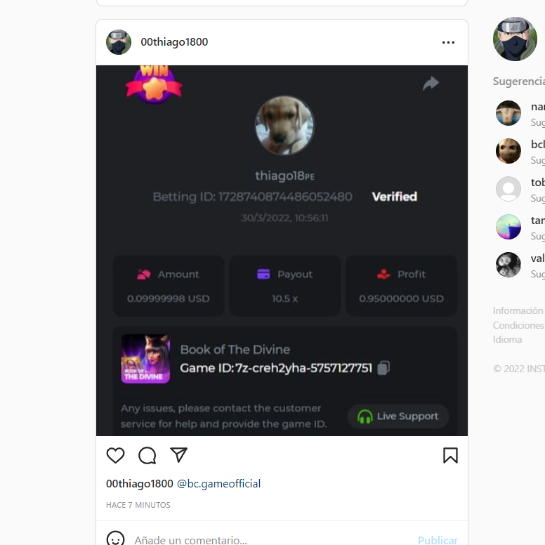 2. Low risk 1. nombre de usuario........ 00thiago1800 2. user.... 00thiago1800 https://www.instagram.com/p/CcgZXHjPNDL/?utm_source=ig_web_copy_link 3. User Thiago18 4. Username facebook... Thiago Soto yucra 5. 2Fa activado Medium risk 6. https://bc.game/sd/?sd=10IQMEGRD6T98Z High risk 7... https://bc.game/sd/?sd=10IQOHBTRBOF83