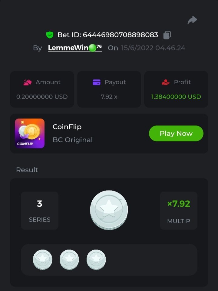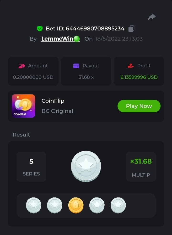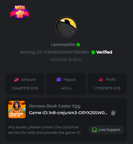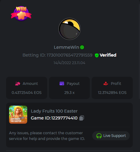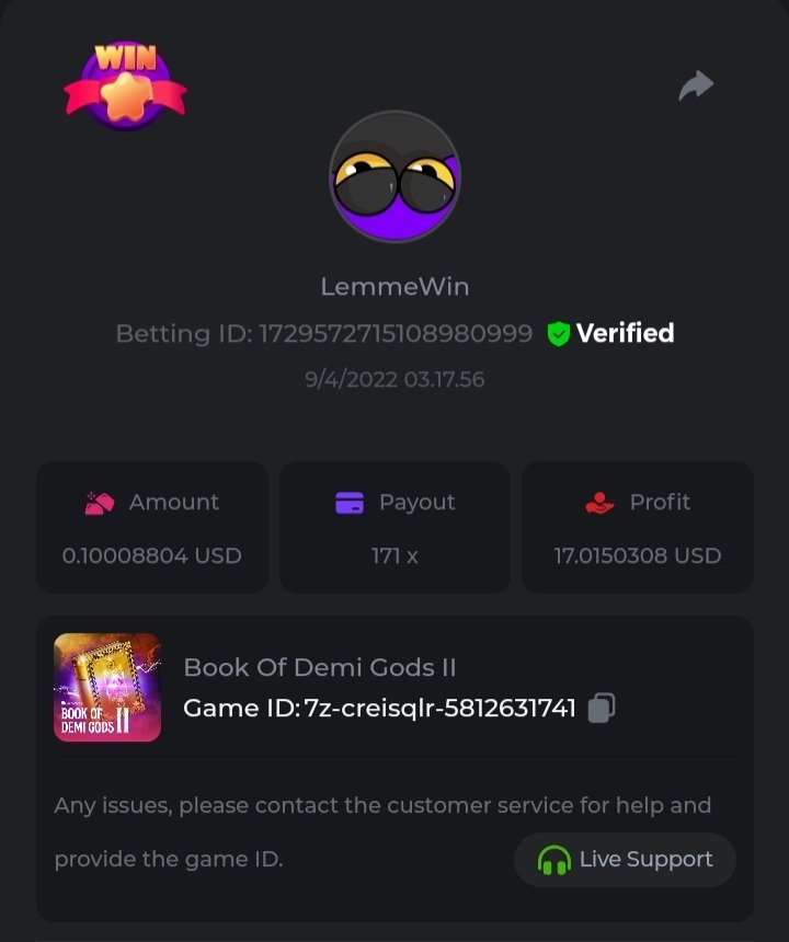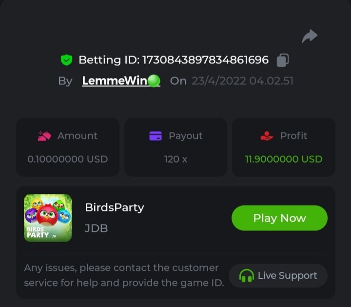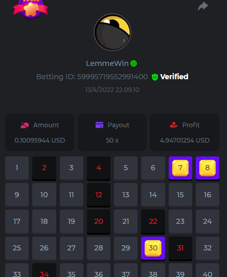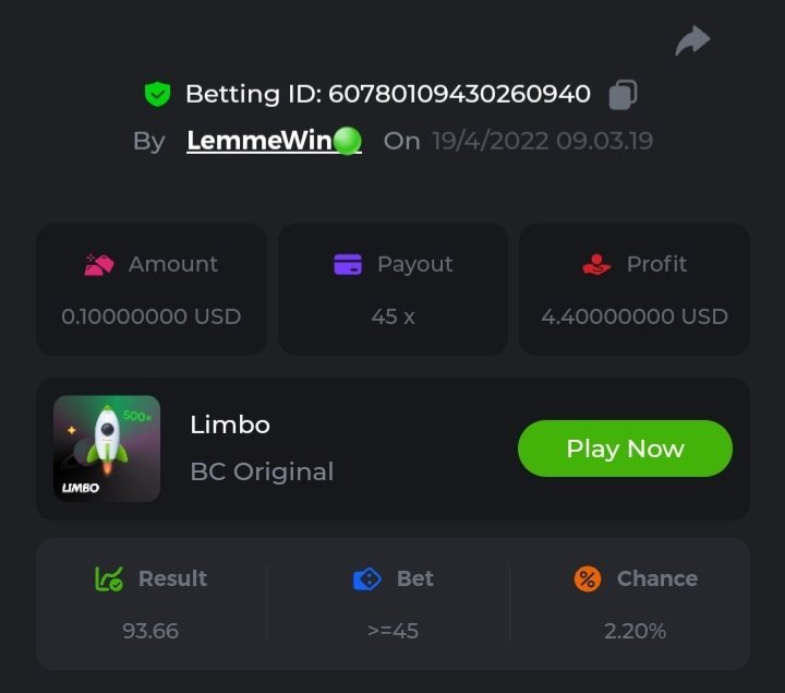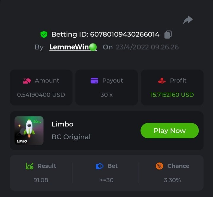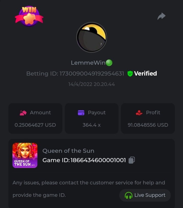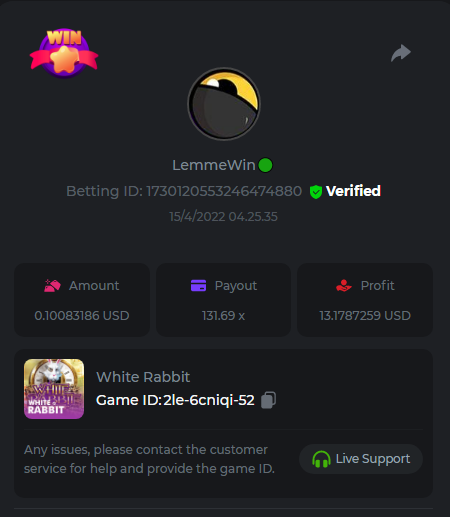 Easy 1. IG profile: https://www.instagram.com/amalive_/ 2. IG profile: https://www.instagram.com/amalive_/ Post link: https://www.instagram.com/p/CcTQ3wCvibE/ 3. Twitter profile: @amalive89 4. Twitter profile: @amalive89 Post link: 5. FB profile: https://web.facebook.com/amalive89/ 6. Cave 7.5x - https://bc.game/sd/?sd=10IDCOEKP2BI1F 7. sports at least 1.3x - 2126003035011425107 8. Lady fruits - https://bc.game/sd/?sd=10IG6J0M1OO5QR 9. Ramses books Easter eggs- https://bc.game/sd/?sd=10IFP1BIBKT0YB 10. 2FA - Yes, have done it a long long time ago lol Medium 1. Easter eggs - https://bc.game/sd/?sd=10IFOLHYPHDGK3 2. Roulette 36x - https://bc.game/sd/?sd=10IDFIUHFBQAKZ 3. Plinko 76x - https://bc.game/sd/?sd=10IEE0DB15K9HV 4. Power of God's - https://bc.game/sd/?sd=10IFJMP03WG7PV 5. Sport single min 2x - 2126162973348212951 6. Hit straight flush 60x - https://bc.game/sd/?sd=10IEHEUAHQIQ6R 7. Keno 50x - https://bc.game/sd/?sd=10IDRBGEPN9TZN 8. White Rabbit min 90x - https://bc.game/sd/?sd=10IGQ9U0T8TY4Z 9. Red BJ - https://bc.game/sd/?sd=10IE0IN6CO3H8Z 10. Bonus Bunnies min 100x - https://bc.game/sd/?sd=10IGTRDTRUKBV7 (IDK the bet record can't be loaded properly, though my net is fine) Hard 1. Wheel 49.5x - https://bc.game/sd/?sd=10IDD5X2G34L5F 2. Plinko 420x - https://bc.game/sd/?sd=10IE5982L5U5UB 3. 4. 5. 6. Chicken Drop 100x - https://bc.game/sd/?sd=10IELODMQ7EP77 7. 8. 9. Keno 259x - https://bc.game/sd/?sd=10IEDSLJQSOEFN 10.