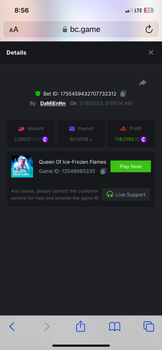 Spinomenal Wolf fang- https://bc.fun/#/sd/111POTFDBLSTUB 112.99x $1.50 bet Queen of ice- https://bc.game/#/sd/111PROVS7F6VWZ 60x $2.00 bet -