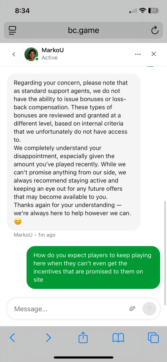 I saw another players post in feedback and I couldn’t have related more with this other player. The same thing is happening to him as what it happening to me. So my replay was this. This same thing happened to me. I also have been with BC.Game for 4 years. I’m VIP 60 with 4k xp left to level up to VIP 61. I haven’t had the easiest time lately being able to wager or anything on bc.game. i got a notification about how my vip host services are going to be stopping. Due to not playing as much. Which is not fair. Considering the loyalty I have provided Bc.Game and how much I have actually deposited there. I earned the right to have my vip host a long while ago. It is part of the advantages of being loyal and raising to the level that I am now with VIP. on July 1st, (my birthday) I asked support about being able to get a birthday bonus and they told me no and that I no longer have vip host services. Which is so wrong, on multiple levels. A vip host is part of the rewards you get for playing at bc.game, which I 100% put in the time, money and work to be able to have these rewards. since they took away my host. I didn’t get a birthday bonus like I would normally. I used to get little bonuses here and there as an incentive to keep on playing at bc.game. Which honestly was awesome. But now… I get nothing. I’ve even deposited quite a bit lately and I don’t even get any lossback of the deposits that I have lost. Like what is the point of playing at bc game anymore. There is no incentives on playing there anymore. It’s such a shame. Truly.