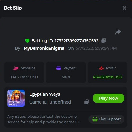 Book of Wolves - Full Moon - 200x @ $0.10 Betting ID: 1732512565935034631 Egyptian Ways - 310x @ $1.40 Bet ID: #1732213992274750592 Book of Rampage - 195x @ $1.50 Bet ID: #1732025723007842311 ($1.50 @ 195x) Book of Rampage - 113x @ $1.50 Betting ID: 1732026516742468224 -