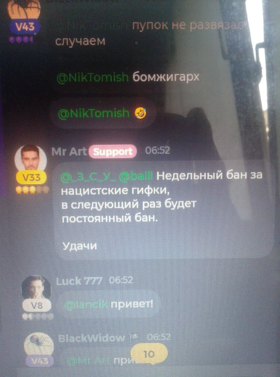 I was blocked by the administrator for putting up in the chat Nazi gifs that were made from the very breech .He from Russia I did not block my friends from ukraine and gave me a ban.I ask you to solve this question.