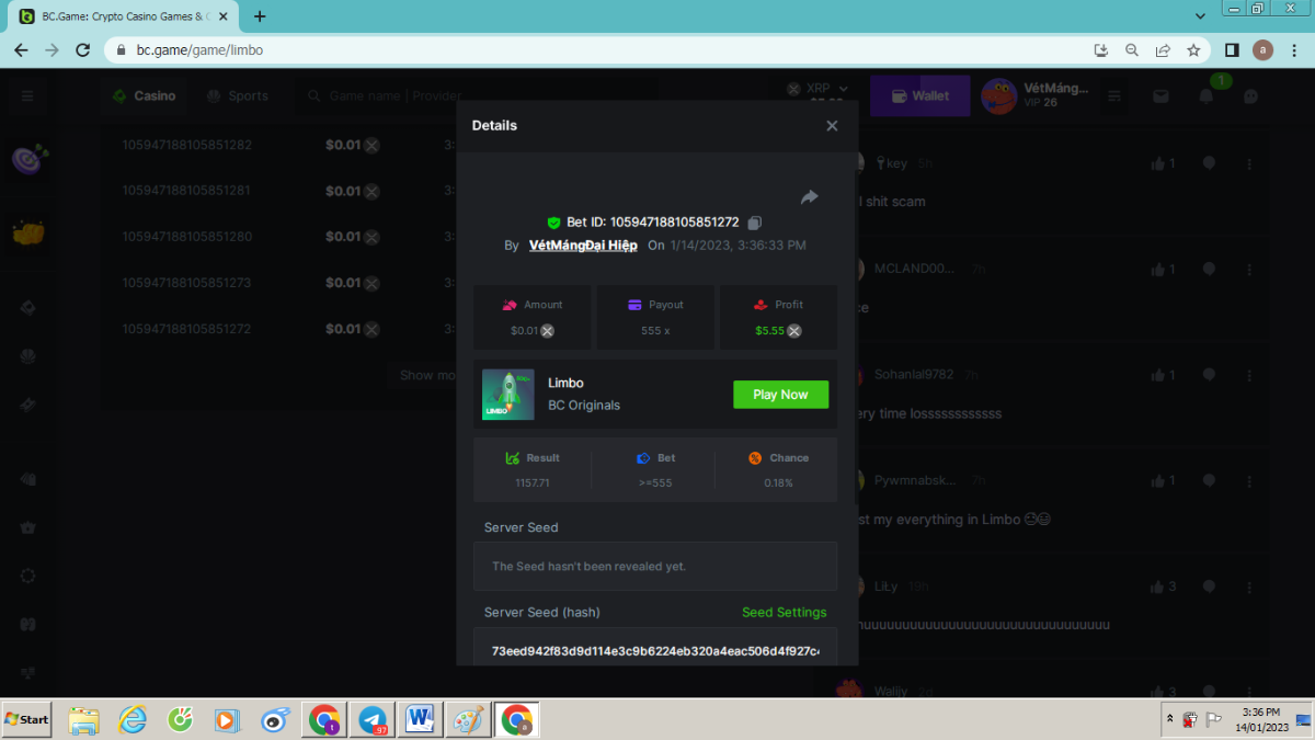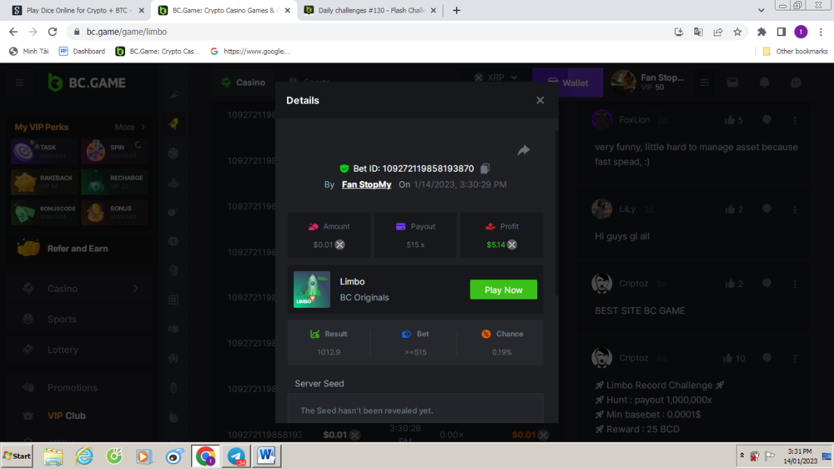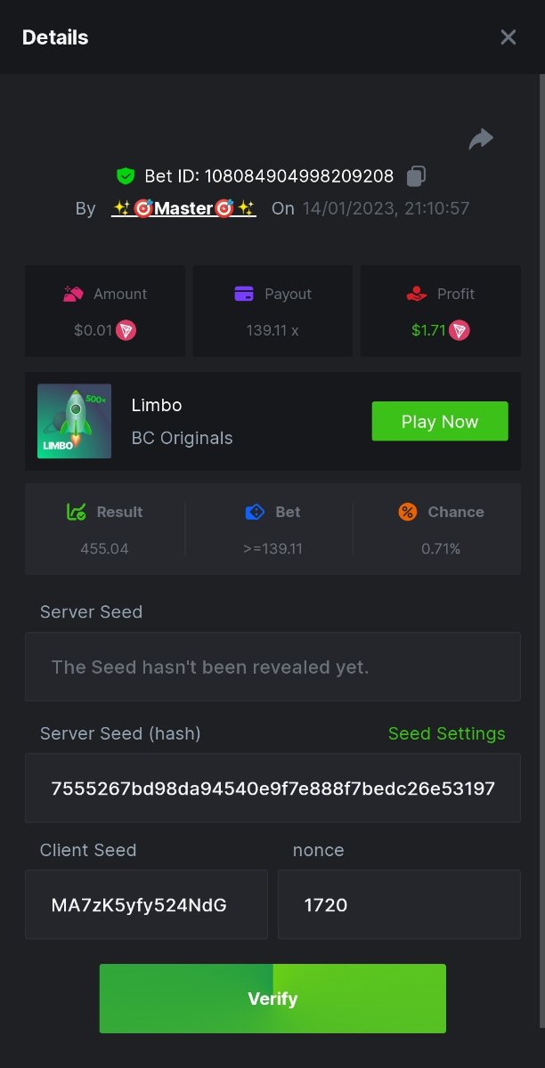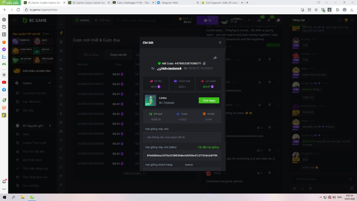 Black Tiger Posted January 14, 2023 Share Posted January 14, 2023 Read Carefully Before Start To Hunt Daily Challenges #130: LIMBOHunt :Win the highest pay outMin Payout requirement 100xMin Level 4If there is a tie, the participant with the higher average bet amount (In USD) shall be the Winner ️Duration Starting : Now End time : 23.59 UTC Time How to Join? Make screenshot + paste your bet link + UID or Profile link Mini bet amount - 0.01$ Any coin allowedReward Prizes 1st Place....... $7 BCD2nd Place..... $5 BCD3rd Place...... $4 BCD 🎖4th Place......$3 BCD5th - 10th Place......$1 BCD 🏵 Winners will be announcing next day after Roll Point Link to comment Share on other sites More sharing options...