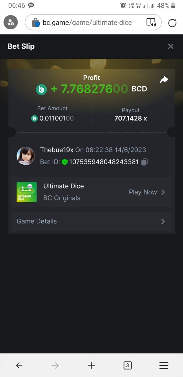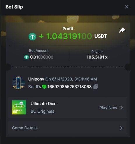 Maksypro Posted June 13, 2023 Share Posted June 13, 2023 Read Carefully Before Start To Hunt Daily Challenges #265 ULTIMATE DICE Hunt : Win the highest multiplier Min Payout requirement 100x Min Level 4 ๏ธDuration Starting : Now End time : 23.59 UTC Time How to Join? Make screenshot + paste your bet link + UID or Profile link Any coin, with min bet 0.01 USD is allowed (jb/bb/bcl not allowed) Reward Prizes 1st Place.....$7 BCD 2nd Place.....$5 BCD 3rd Place.....$4 BCD 4th Place.....$3 BCD 5th Place.....$2 BCD ๐ต Winners will be announcing next day after Roll Point! Link to comment Share on other sites More sharing options...