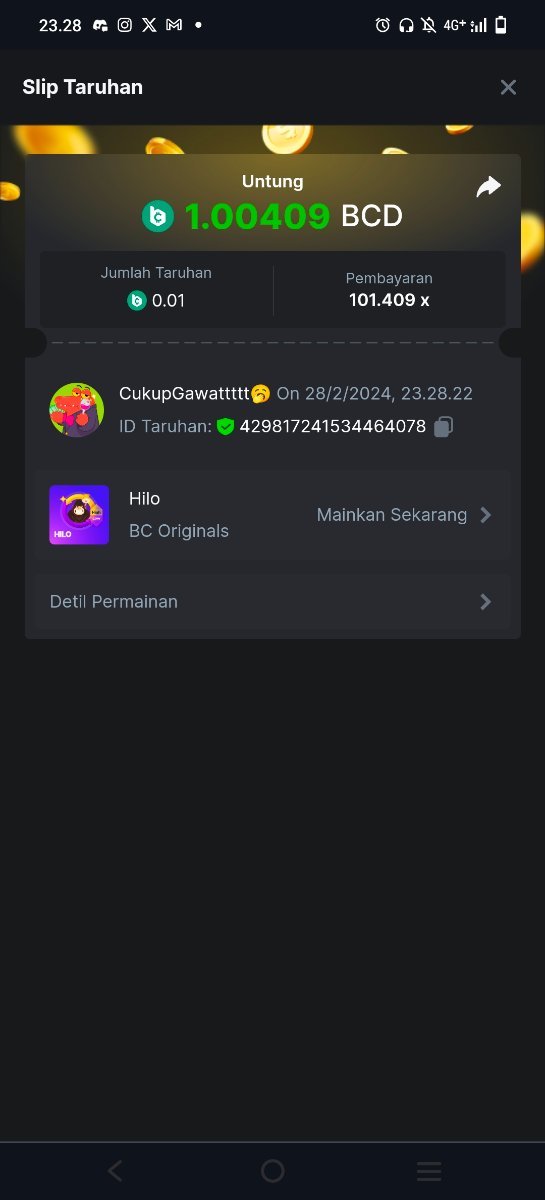 Moderator Giandreas Posted February 28, 2024 Moderator Share Posted February 28, 2024 Read Carefully Before Start To Hunt Forum Daily Challenges #524Hunt : HiLo Win the highest pay out Min Payout : 20x Min Level 10️Duration Starting : Now End time : 23.59 UTC Time How to Join? Make screenshot + paste your bet link + UID or Profile link Any coin, with min bet 0.01 USD is allowed (jb/bb/bcl not allowed)Reward Prizes 1st Place.....$7 BCD 2nd Place.....$5 BCD 3rd Place.....$4 BCD 4th Place.....$3 BCD 5th Place.....$2 BCD 🏵 Winners will be announcing next day after Roll Point! Link to comment Share on other sites More sharing options...