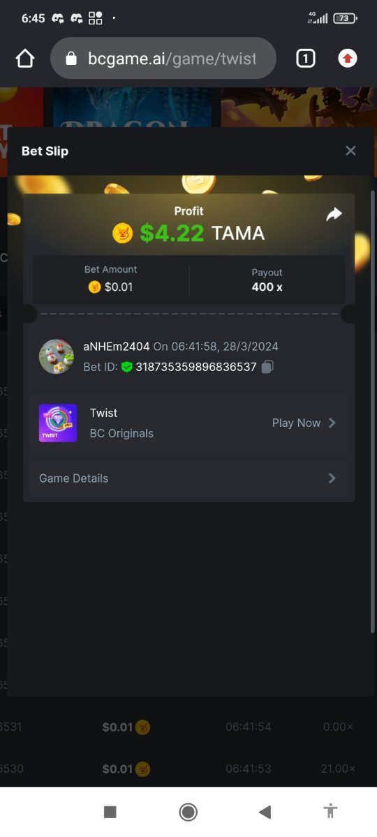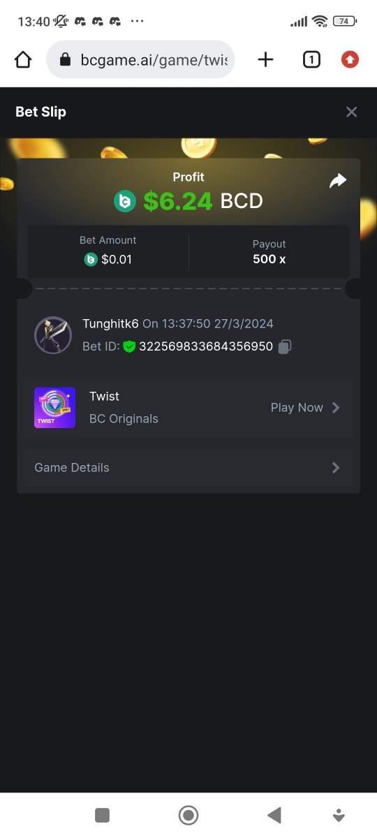 GHOST354 Posted March 27, 2024 Share Posted March 27, 2024 Hello 2 minutes ago, Kikikom said: Read Carefully Before Start To Hunt Forum Daily Challenges #552Hunt : Twist Win the highest pay out Min Payout : 17x Min Level 10️Duration Starting : Now End time : 23.59 UTC Time How to Join? Make screenshot + paste your bet link + UID or Profile link Any coin, with min bet 0.01 USD is allowed (jb/bb/bcl not allowed)Reward Prizes 1st Place.....$7 BCD 2nd Place.....$5 BCD 3rd Place.....$4 BCD 4th Place.....$3 BCD 5th Place.....$2 BCD 🏵 Winners will be announcing next day after Roll Point! Link to comment Share on other sites More sharing options...