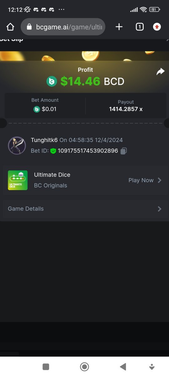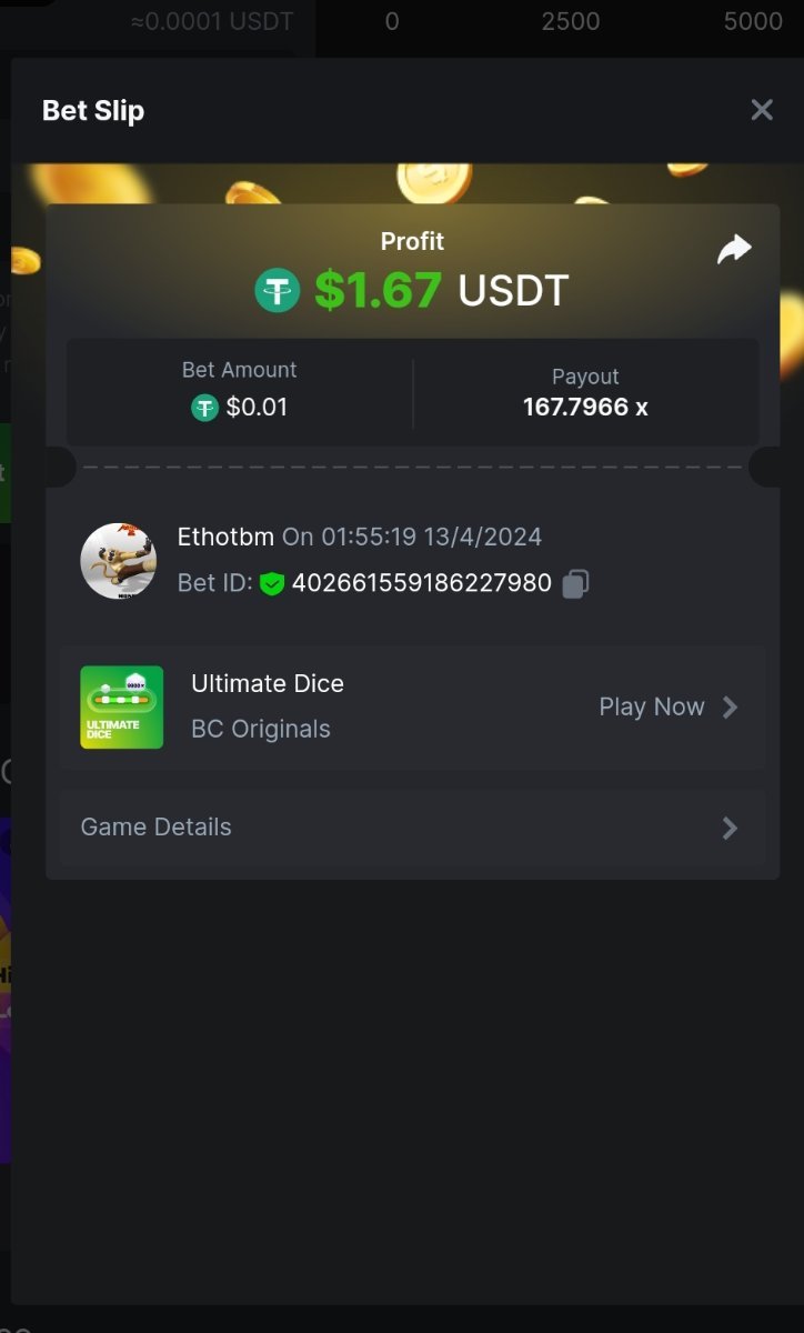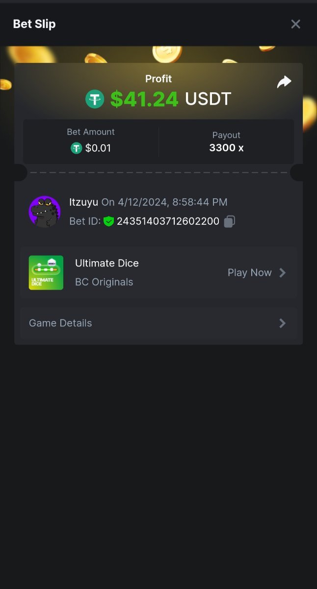 Moderator Giandreas Posted April 12, 2024 Moderator Share Posted April 12, 2024 Read Carefully Before Start To Hunt Forum Daily Challenges #568Hunt : Ultimate dice Win the highest pay out Min Payout : 50x Min Level 10 ️Duration Starting : Now End time : 23.59 UTC Time How to Join? Make screenshot + paste your bet link + UID or Profile link Any coin, with min bet 0.01 USD is allowed (jb/bb/bcl not allowed) Reward Prizes 1st Place.....$7 BCD 2nd Place.....$5 BCD 3rd Place.....$4 BCD 4th Place.....$3 BCD 5th Place.....$2 BCD 🏵 Winners will be announcing next day after Roll Point! Link to comment Share on other sites More sharing options...