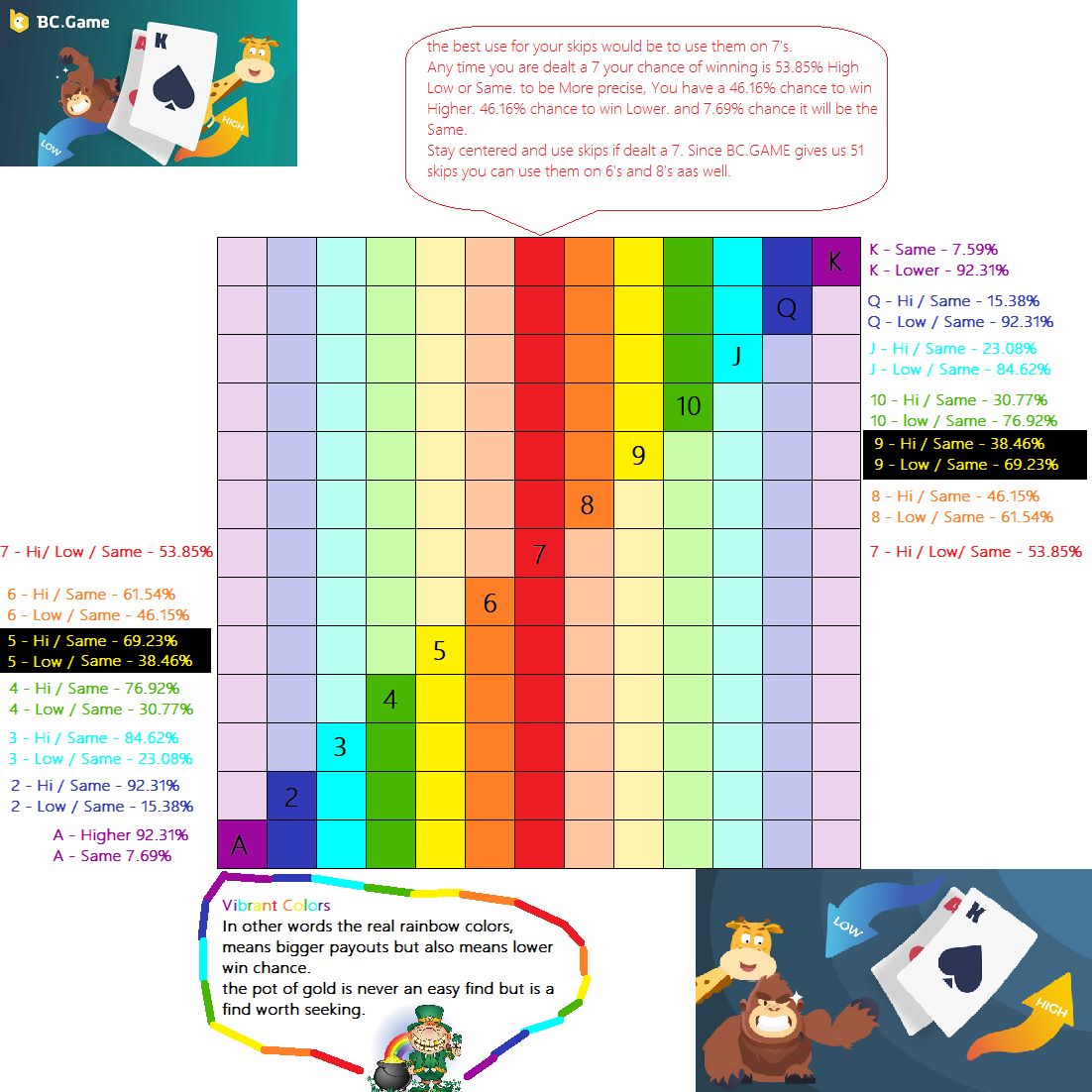 Monstrous Eberto Posted August 8, 2020 Share Posted August 8, 2020 Bc.game Hi Lo game has a few changes to it that differ from what I've played elsewhere. thus making it a unique version of the game Hi Lo. The change i like most is that we are aloud to skip 51 cards in a game giving us way more chances to better our odds to win and have more cards which also means higher payouts. the change i dislike most is that the result card (final card) that ends the round is not the base card (start card) of the next round. A change im unable to decide if i like or dislike is that there are either 4 or more decks being used, or once a new card is drawn the one prior to it get shuffled into the deck. this makes it rather difficult to know if im playing with just one deck, or if im playing against 4 entire decks. im not seeing any information about this in the game. I'm assuming they use one deck and once a card is dealt it is put right back into the deck of 52 cards and shuffled each time a card is dealt. Thus, making it completely random because the chances of drawing a card remains the same the entire round of game play. this being said, there's simply no way for you to base judgement of the next card based on the previous card(s) played. and this is where i'm still undecided if i like this change. because it removes the ability to count cards. which is a this also means that graphing out the probability is simple and anyone with basic understanding of cards is in a pretty good position win. despite not knowing the exact way the cards are dealt, The fact is, the probability does not fluctuate as you play the game. So long as you understand that the card that was just dealt can come out next you know why the win and lose chance are constant and dont ever change. heres another way to help understand what you're probabilities are while playing Hi Lo. because im terrible with numbers and Math, i relate Hi Lo with a rainbow. see the picture below; in-case you want to use translate to understand the picture here's what i wrote in the picture above; (at top in red) say's, "the best use for your skips would be to use them on 7's, any time you are dealt a 7, your chance of winning is 53.85% High Low or Same. to be more precise, you have a 46.16% chance to Win Higher, 46.16% chance to win Lower, and a 7.69% chance it will be the Same. Stay centered and use skips if dealt a 7. Since BC>GAME gives us 51 skips, you can use them on 6's and 8's as well." (at bottom with leprechaun) says, "Vibrant Colors in other words the real rainbow colors, means bigger payouts but also means lower win chance. the pot of gold is never an easy find, but is a find worth seeking" hope this helps someone to win thanks for reading. Link to comment Share on other sites More sharing options...