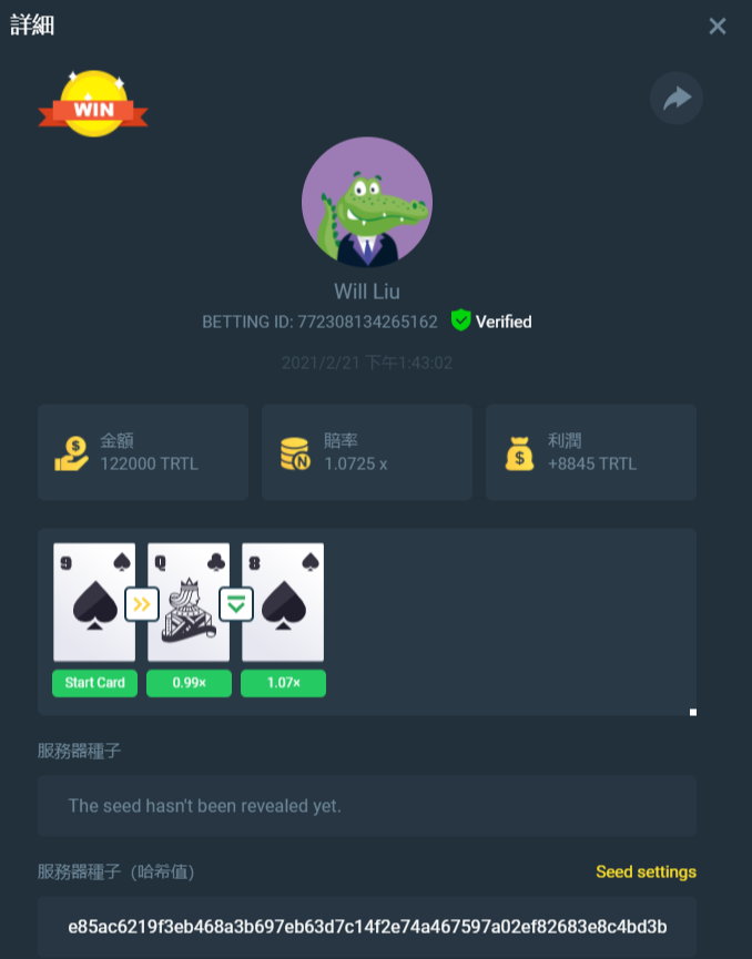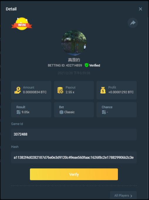 參加方法:回覆這個帖子、並貼上 2021/2/20 至 2021/2/21 18:00 (UTC+8) 之間任何遊戲最大獲利的押注記錄截圖。如果你多次張貼不同的押注截圖、則將以你最大獲利的為主。