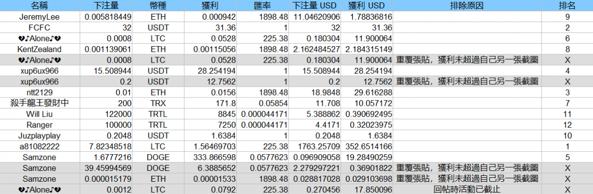 每個人的獲利會轉為美金計算、並依大到小排序,若遇到獲利相同則再以下注時間先後排序。