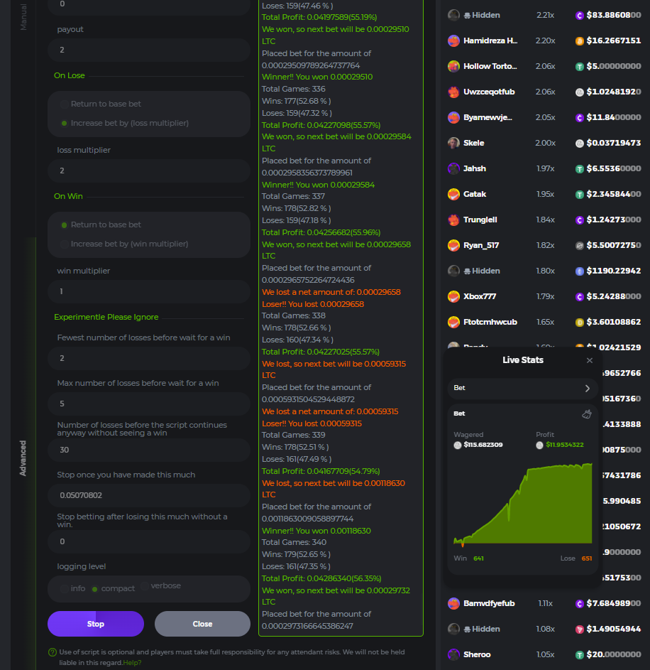 @Skele - hope that you are still  around.  This is an old thread.  I have a question please.  I have been using your script since I found it some days ago very successfully.  My question is : Are you able to add another criteria box where you can add a number of consecutive games to play if you successfully reach your set payout each time.  So you reach your payout and then the game start again.  So example I want to play 10 games and each time I reach my payout, it continues playing until 10 games are played or until all fund are lost if no stop loss is set.  Hope to hear back from you.  It's an amazing script!!!