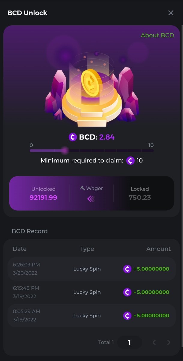 You will need to accumulate of minimum 10 BCD to be able to claim from locked BCD pot. The rackeback % from locked bcd should be correct.