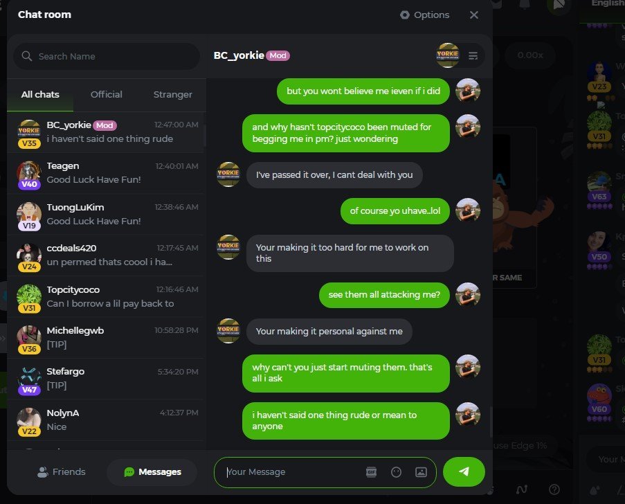 Apparently according to Yorkie, asking that he rightfully mute someone who was begging me in pm's (that i sent him a screenshot of) and taking action against the people in chat that harass/insult/attack me constantly is making it 'too hard' for him to do his job. Well, it seems like he probably shouldn't have this job to me. Apparently asking he enforce the rules against those players who violate them in regards to harassing and insulting me constantly is making it personal against him. No, he's making it personal against me by refusing to enforce the rules when it comes to people who violate them by harassing me constantly. I didn't say one rude thing in chat today. Yet he brings up a PM conversation we were having and responds to it in open chat. He asks me for proof of the people I said scammed me, which I gave him, but he says it's not good enough. Yet he lets people refer to me as a scammer constantly and when they don't show him proof, he doesn't mute them! All i ask is the rules be applied fairly and equally. I don't understand how I get muted when I didn't say one rude thing in chat, even in response to those who were attacking me. But i'm the one that gets muted..I'm beyond confused and frustrated, but I think that's what ya'll want.